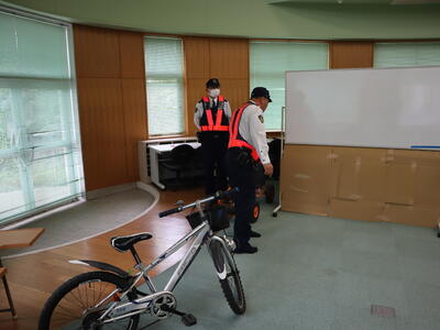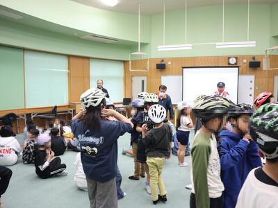 雨で室内での実施となりましたが、手を挙げて横断歩道の渡る練習をしたり、ヘルメットのあごひもを調節したりしました。ヘルメットは緩んでいると事故の時にヘルメットが飛んでしまいます。点検してみるとあごひもが緩んでいる子が多く、教師と一緒に調節を行いました。