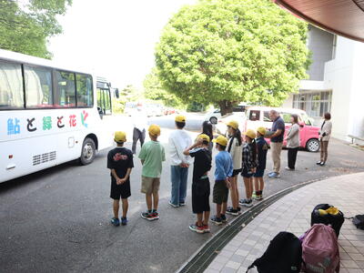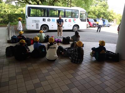 5年生は、児童玄関で出発式を行い予定通り午前8時30分にあしきた青少年の家に向けて出発しました。