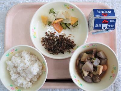 里芋コロッケ、五目きんぴら、豚汁、麦ご飯、牛乳