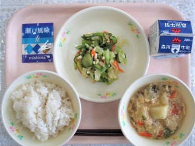 イカのネギ焼き、けんちん汁、磯か和え、梅ご飯、牛乳