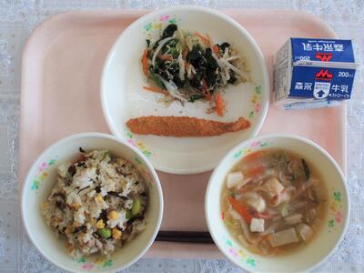 白菜の中華スープ、ししゃもフライ、ナムル、五目混ぜ飯、牛乳