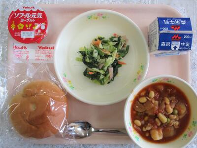 ポークビーンズ、ほうれん草サラダ、ヨーグルト、丸パン、牛乳