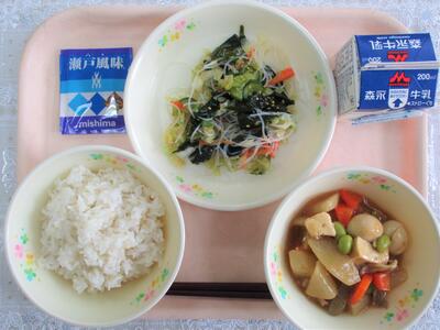 味噌煮込み大根、春雨の和え物、ふりかけ、麦ご飯、牛乳