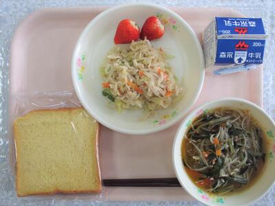 ニラ肉味噌ビーフン、切干大根の胡麻サラダ、イチゴ、カボチャパン、牛乳