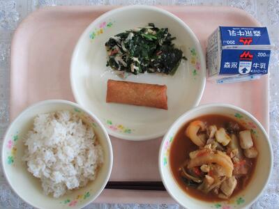 ニラとささみの胡麻和え、豆腐チゲ、春巻、むぎごはん、牛乳