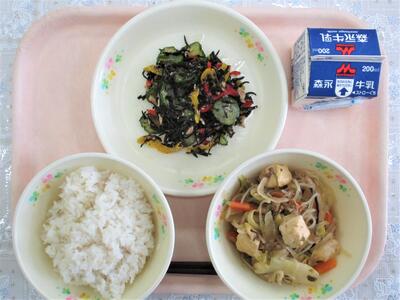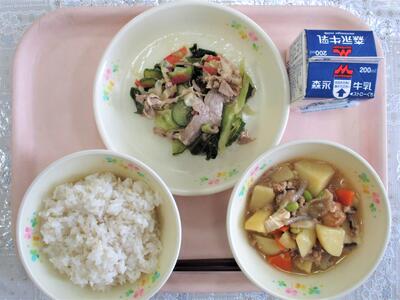 スタミナサラダ、新じゃがのそぼろ煮、麦ご飯、牛乳