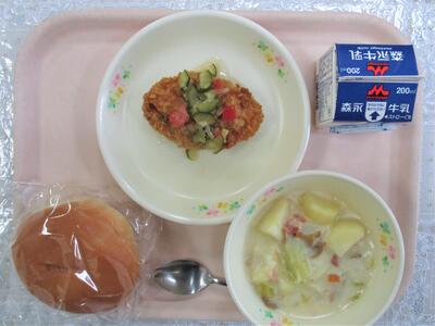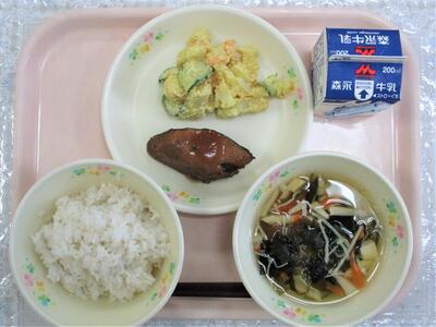 カツオの生姜煮、ジャガイモのカレーマヨ、若竹汁、麦ご飯、牛乳