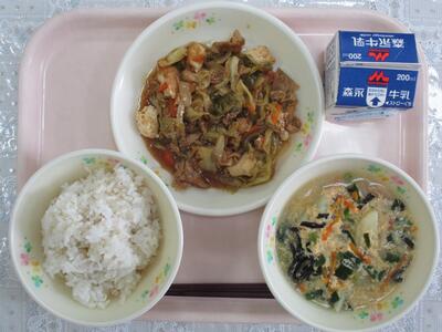 回鍋肉、ニラ玉汁、麦ご飯、牛乳