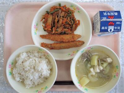 五目きんぴら、ししゃもフライ、豚汁、麦ご飯、牛乳