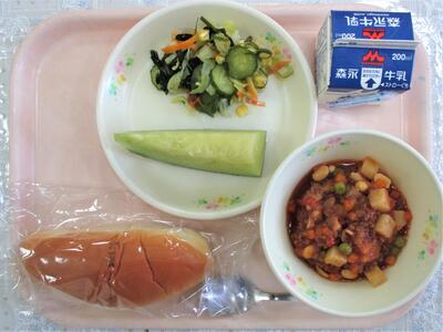 チリコンカン、海藻サラダ、メロン、ミルクパン、牛乳
