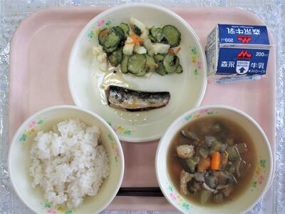 夏野菜のカレーライス、切り干しの胡麻サラダ、もものタルト、牛乳