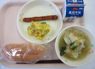 セルフドッグ、ラビオリスープ、カボチャサラダ、牛乳