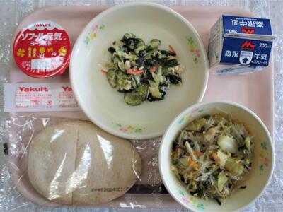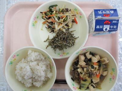 五色和え、ニラ豆腐、青のりいりこ、麦ご飯、牛乳