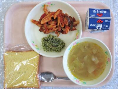 鯖の香草焼き、ペンネアラビアータ、野菜スープ、カボチャパン、牛乳