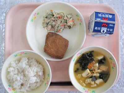 ゴーヤのツナ和え、しのだ煮、味噌汁、麦ご飯、牛乳