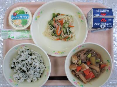 冬瓜の煮物、そうめんサラダ、ワカメご飯、シークワーサーゼリー、牛乳