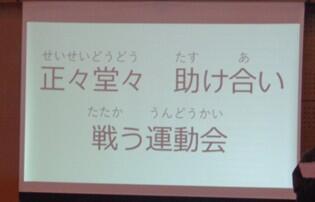 体育委員会が会を進行し、みんなで決めたスローガンの発表がありました。今年のスローガンは