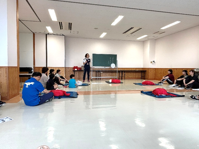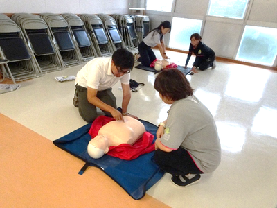 6月16日 PTA救急救命講習会 投稿日時 : 07/30 学校サイト管理者 今年も講師に緒方さん(日本赤十字指導員)をお招きし、職員及び保護者の講習会を開きました。プールの授業も始まりますので、緊急時に迅速に対応できるよう真剣に取り組みました。
