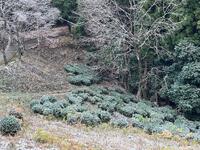 駐車場の記念碑にも雪 花壇のパンジーにも雪 裏の茶畑にも雪