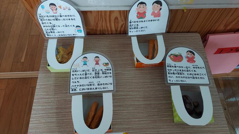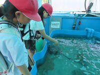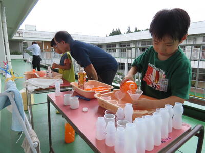 1年生は、形の異なる二つの容器に入っている色水の量をたくさんのカップの中から比べるのに適当なものを選んで体積を比べる学習でした。