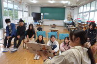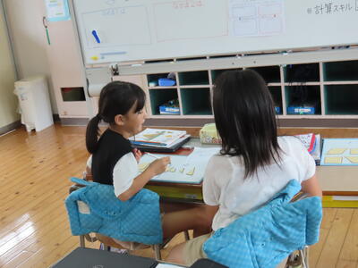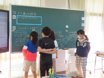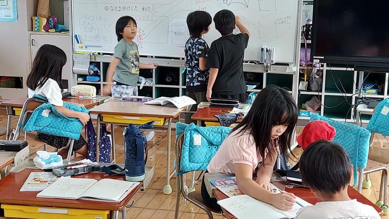 教室の中では、2年生の学習が行われていて、ペアで話し合っている子どもたちもいれば、黒板の前に集まって板書を見ながら話し合っている子どもたちがいました。