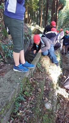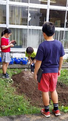 授業が始まるころ同じ場所に行ってみると、教頭先生が水を流し、子どもたちがタブレットで動画を撮ったり水が土の上を流れていく様子を観察したりしているところでした。