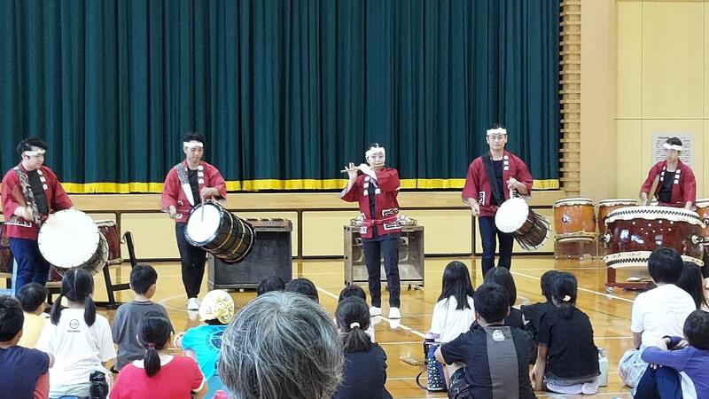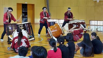 昨日の午後、芸術鑑賞会として 太鼓芸能集団「紬衣」の皆さんが励徳小に来ていただきました。