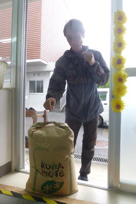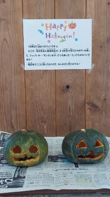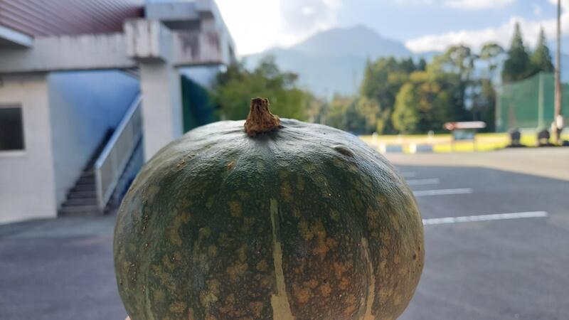 今日は、学校の入り口(登校坂の下)で交通指導委員の上野さんと一緒に子どもたちの登校を見守っていると、地域の緒方さんが軽トラックで通りかかられかぼちゃを一つずつくださいました。