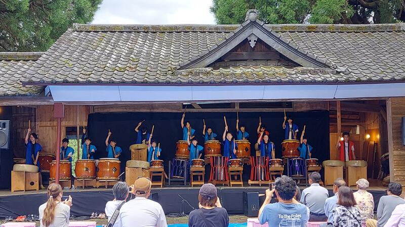 午後は、校区内にある勢井阿蘇神社前にある農村舞台で行われた「山と風の音楽祭」に特別出演として全国各地から集まったプロの音楽家の皆さんに交じり演奏をさせていただきました。