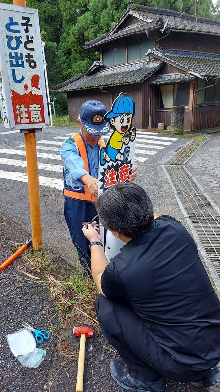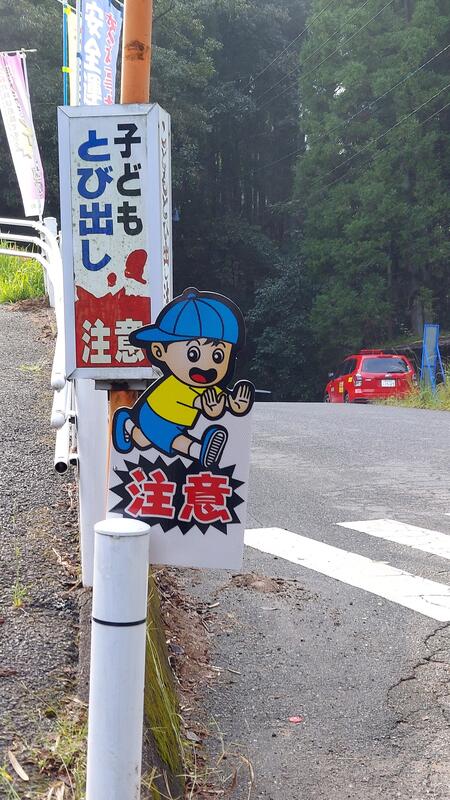 朝からあいさつ坂の下に立っていると、昨日の疲れか、若干お疲れモードの子どもたちが登校してきました。そこに役場の方がいらっしゃって、先日、学校の下の道を結構なスピードで通り過ぎる車を見かけたからと言って、立て看板を設置に来ていただきました。