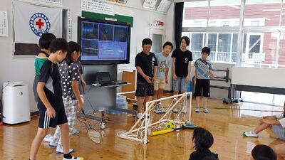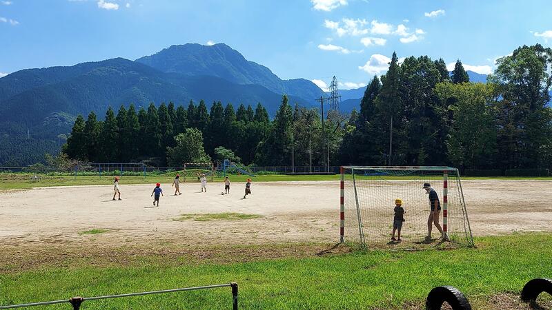 トンボが飛び交う中、サッカーを楽しむ子どもたち。