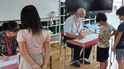 子どもたちは、メモする紙やタブレットを持参して校長室に入ってきました。
