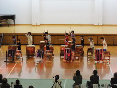 最初に各団体の太鼓の演奏をみんなで聞きました。どの団体も素晴らしい演奏でした。励徳小は、5番目に演奏をしましたが、すごいメンバーの前でものおじすることなくいつも通りの演奏ができました。