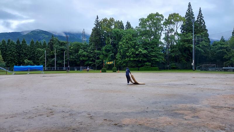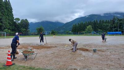 体育館での実施も考えましたが、午前中は曇りの予報でしたので運動場整地に取り掛かりました。