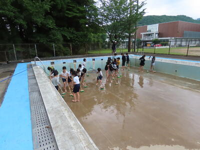 この状態の中に子どもたちを入れるのは忍びないと超ベテラン男性教員が予備プール掃除を行ってくれました。おかげで子どもたち28人でもなんとか掃除をすることができました。