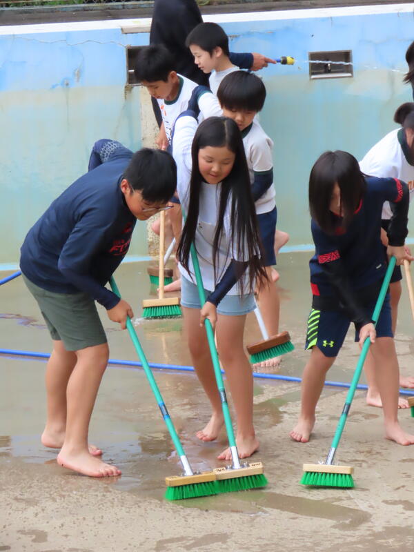 励徳小のプール掃除は、1~6年生全員で行います。ほかの学校より狭いプールとはいえ、28人で行うにはかなりの広さです。また、プールの周りは杉の大木や広葉樹が生い茂り、プールの中には木々の枝葉がたくさん。更にオタマジャクシがうようよ。