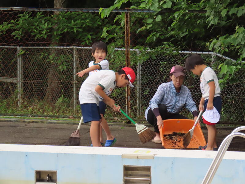 この日は、雨が降るか降らないかと微妙なお天気でしたが、予定通りプール掃除が行われました。