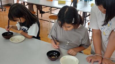 早く食べ終わった子どもたちは、大豆つかみに挑戦。
