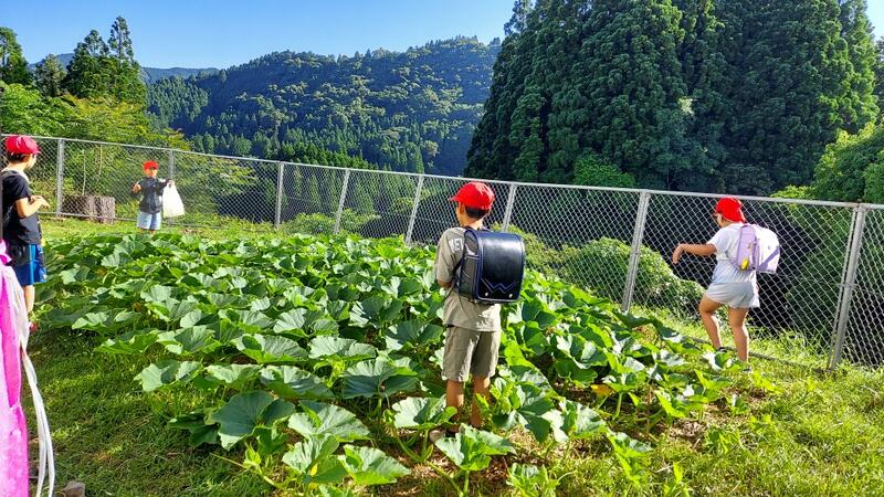 植え方のご指導をいただいた片山さんが毎日のように見に来ていただいていますが、子どもたちも毎朝、教室に行く前にかぼちゃ畑に様子を見に行っています。