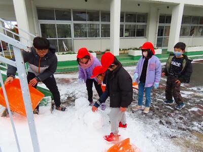 24日(水) 「雪遊び」 寒波のため、久しぶりに雪が積もったので、全校児童が外に出て雪遊びを行いました。雪だるまづくりや雪合戦、そり遊びなど各学年とも工夫しながら雪を利用して楽しむことができました。