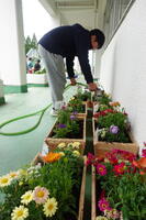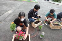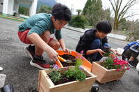 1月22日、熊本県宇城地域振興局林務課の方から教えていただき、5,6年生が木材でプランターを作りました。そのプランターに昨日、花の苗を植えました。