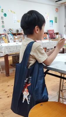 子どもたちは、エコバッグとして使う子もいますが、見つけました、図書室で。