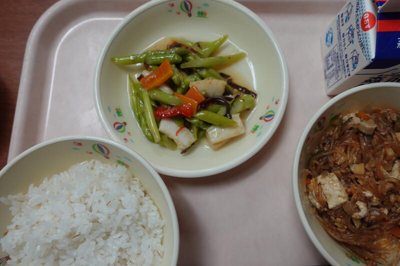 今日は、給食にJAからいただいたアスパラを使った「イカとアスパラの中華炒め」が出ました。