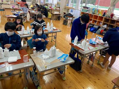 18日(水) 「3年生の図工」 今日は3年生の教室に来てみると、ペットボトルと粘土で何かを作っていました。聞いてみると、「自分の町」だそうです。海にイルカが見えたり、寝そべってくつろいでいる人がいたりと自分らしいユニークな町ができそうです。完成を楽しみにしています。