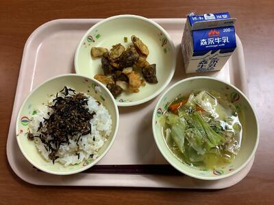 12日(火) 「本日の給食」 今日の献立は「麦ご飯、牛乳、ワンタンのねぎゴマスープ、鶏とごぼうのピリ辛揚げ、手作りしそひじきふりかけ」でした。スープ、揚げ物、ふりかけ、それぞれに味わいがあってご飯に合い、とてもおいしくいただきました。