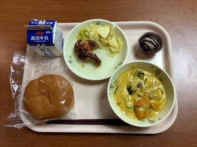 21日(木) 「本日の給食」 今日の献立は「丸パン、牛乳、カボチャのクリーム煮、ローストチキン、カップケーキ、白菜とリンゴの柚サラダ」でした。今年最後の給食となりましたが、クリスマスにちなんだチキンやケーキ、そして地元の野菜を使ったクリーム煮やサラダがあいまってとてもおいしくいただきました。今年1年間のおいしい給食の提供に感謝いたします。