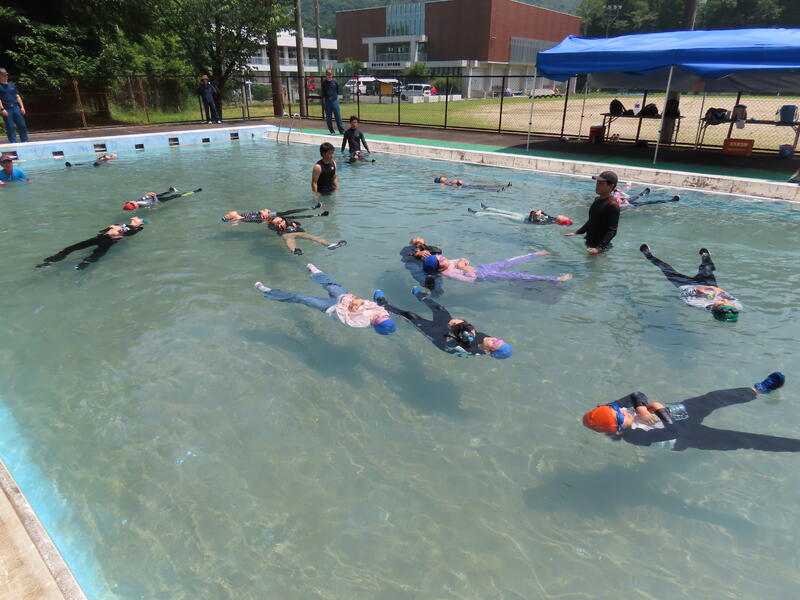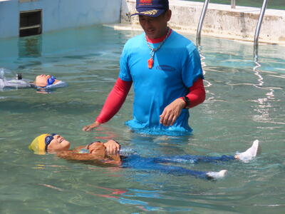 実際に消防署の方々もプールに入ってやって見せていただきながらの学習でした。