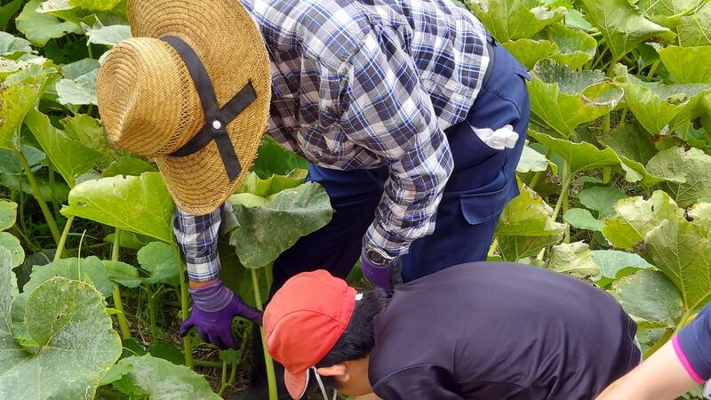 片山さんに収穫の仕方を教えてもらいました。3㎏はあろうかというかぼちゃですから切るのも一苦労。