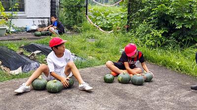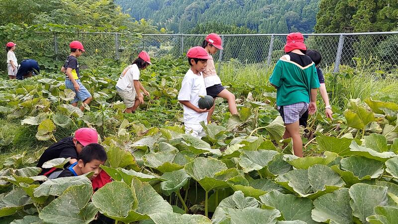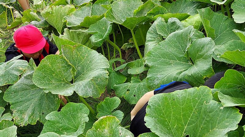 と声を掛けられ、畑に行くと、子どもたちは、どのカボチャを収穫しようかと品定め中でした。