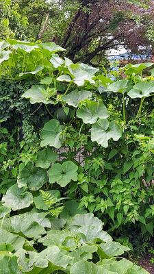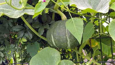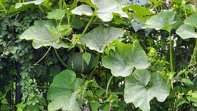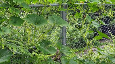 どんどん伸びて、かぼちゃの蔓は、フェンスをよじ登り立派な「空中かぼちゃ」もなりました。